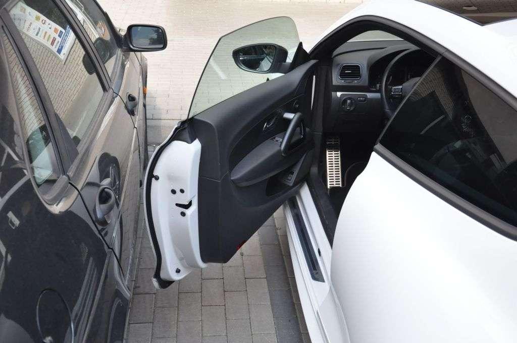 …kiedy pod maską czeka na mnie tabun 265 koni mechanicznych. Najpierw jednak muszę zająć miejsce w środku. Przyznam się, że podchodziłem do niższego ode mnie o 60 cm Scirocco z pewną obawą. Przypominał mi się test Mazdy MX-5, w której mogłem się wyprostować dopiero po otwarciu dachu. Moje wsiadanie do Scirocco rzeczywiście przypomina gimnastykę, ale po zajęciu miejsca w umiarkowanie wyprofilowanych fotelach wiem już, że problemu z miejscem nie powinno być. Przynajmniej dużego problemu – bo przy poprawnie ustawionym fotelu czupryna szoruje mi po podsufitce. To mały problem, ale denerwujący. Zniknął po delikatnym odchyleniu oparcia do tyłu, ale pojawił się inny – ból pleców w części lędźwiowej, odczuwalny po dłuższej jeździe. Dwa metry wzrostu to jednak jest pewien problem w małych autach.