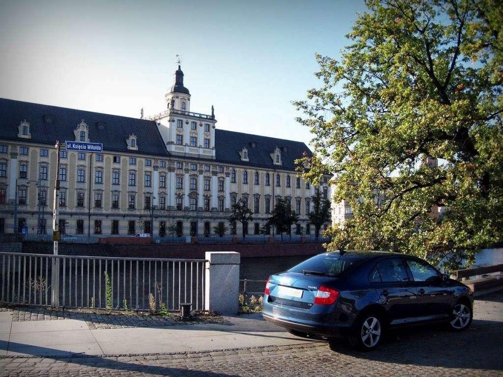 Test rozpoczął się we Wrocławiu i już miałem z niego wyjeżdżać, gdy naszła mnie drobna refleksja - czy w sercu województwa dolnośląskiego nie ma żadnych zamków? Dzieciom powtarza się, że pochodzą z kapusty, jednak świat idzie do przodu i niedługo większość rodziców będzie im mówiła, że zostały ściągnięte z Internetu – ja też postanowiłem sięgnąć do tej zdobyczy techniki i szybko dowiedziałem się, że we Wrocławiu zamków jest całkiem sporo. Kilka chwil później zaparkowałem Rapida przy Odrze. Mocno pochylona szyba na klapie i zadarty tył nie ułatwiały manewrowania, ale czujniki parkowania na szczęście pomogły. I to pomimo tego, że w zderzaku są zaledwie 3. Auto ładnie prezentowało się na tle Uniwersytetu Wrocławskiego, jednak co on ma wspólnego z zamkami? Na terenie uczelni powstał zamek prawdopodobnie jeszcze za czasów Henryka I Brodatego. Ostateczny kształt nadał mu Karol IV Luksemburski jednak w późniejszych czasach zaczął być sukcesywnie likwidowany. W końcu zniknął całkiem a jego powierzchnię zajął Uniwersytet Wrocławski w 1702 roku. Wrocław obejmuje również mniej znane budowle – jedna z nich znajduje się w Leśnicy.