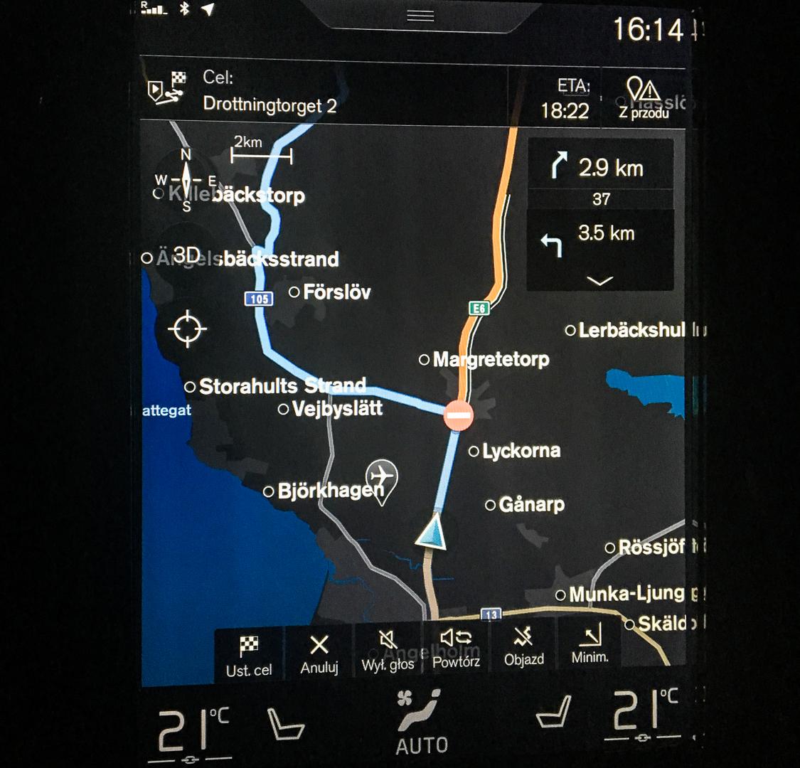 Po zakończeniu przeprawy promowej charakterystyka naszej jazdy diametralnie się zmieniła. W szwedzkich miastach przeważnie obowiązuje ograniczenie prędkości do 40 km/h, a w wielu miejscach nie wolno przekraczać 30 km/h. Utrzymywanie takiej prędkości w mieście jest uciążliwe, nawet jeśli wszyscy stosują się do ograniczeń. I w tych momentach doceniliśmy aktywny tempomat z asystentem jazdy w korku, który podczas długich przejazdów od skrzyżowania do skrzyżowania okazał się nieoceniony.