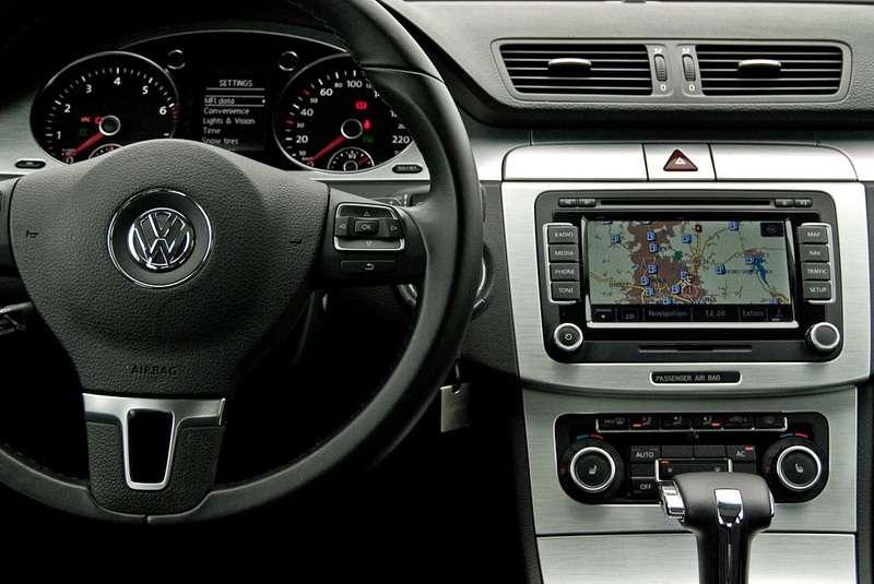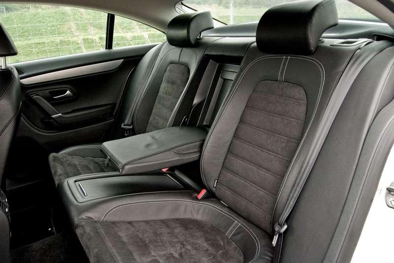 Znakomitym przyjacielem zarówno w dalekich wojażach jak i dynamicznych przejażdżkach okazuje się też wnętrze. W CC jest bliźniaczo podobne do tego ze standardowego Passata. Znajdziemy tu trochę twardego czarnego plastiku w naszym egzemplarzu połączonego z wykończeniem z tworzywa udającego (trzeba przyznać, że znakomicie) szczotkowane aluminium. Wszystko wykonane ze wzorową, jak przystało na VW, dbałością o ergonomię i jakość montażu. Profilowane fotele, pokryte skórą i Alcantarą, z powodzeniem spełniają swoje zadanie utrzymania ciała kierowcy w idealnej pozycji nawet przy solidnych przeciążeniach. Można mieć obiekcję co do zbyt wysokiej pozycji za kierownicą. W takim samochodzie powinno się siedzieć znacznie niżej i wychylać jedynie czubek nosa znad linii okien. Do dyspozycji mamy tu mnóstwo elektronicznych systemów wspomagających prowadzenie. Znakomicie spisuje się adaptacyjny tempomat oraz system ostrzegania przed kolizją (Front Assist). W parkowaniu wydatnie pomoże system Park Assist z kamerą cofania, który samodzielnie zaparkuje samochód (4970 zł) czy Lane Assist (2590 zł) ostrzegający przed niekontrolowaną zmianą pasa ruchu. Najwyższe noty dostaje od nas rewelacyjna, warta każdych pieniędzy (nawet tych 8 tys.), nawigacja z dużym dotykowym ekranem, wbudowanym 30 GB dyskiem twardym i czytnikiem kart SD. Charakterystycznym elementem w CC jest tylna kanapa przystosowana jedynie dla dwóch osób. Mają one do dyspozycji właściwie dwa oddzielne siedzenia, przedzielone szerokim składanym podłokietnikiem i wbudowanym uchwytem na kubki. Od początku roku za dodatkowe 700 zł oferowana jest standardowa tylna kanapa, która ugości trzy osoby. Traci na tym prestiż, traci komfort podróżujących z tyłu – ale widocznie rynek zweryfikował potrzebę wprowadzenia takiego rozwiązania.