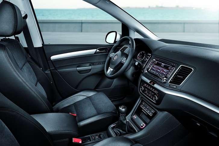 Nowy Sharan w podstawowej wersji wyposażony jest w 7 poduszek powietrznych (w tym poduszka kolanowa kierowcy), funkcję automatycznego włączania świateł awaryjnych przy gwałtownym hamowaniu, elektryczny hamulec postojowy z systemem ułatwiającym ruszanie pod górę, ESP (wraz z ABS, elektroniczną blokadą mechanizmu różnicowego EDS, funkcją wspierającą kontrowanie kierownicą oraz wskaźnikiem ciśnienia w oponach), 16-calowe koła, przyciemniane szyby termoizolacyjne, trzystrefową klimatyzację, elektrycznie sterowane wszystkie szyby, centralny zamek i radioodtwarzacz CD. W wersji Comfortline dodatkowo dostaniemy aluminiowe felgi, sportowo wyprofilowane siedzenia, skórzaną kierownicę, składane foteliki w oparciach, fotel kierowcy sterowany elektrycznie, czujnik deszczu, automatyczne przełączanie świateł drogowych z funkcją Coming home i Leaving home. W topowym wyposażeniu Highline dodatkowo są 17-calowe koła ze stopów lekkich, chromowane wstawki karoserii (relingi dachowe, listwy otaczające halogeny), podgrzewane przednie fotele, kierownica wielofunkcyjna. Poza trzema konfiguracjami Sharana można indywidualnie doposażyć m.in. w nowy Light Assist (automatyczne sterowanie światłami drogowymi), elektrycznie otwierane i zamykane rozsuwane drzwi oraz tylną pokrywę, adaptacyjną regulację zawieszenia DCC, regulację poziomu zawieszenia Nivomat, sportowe zawieszenie, nową generację Park Assist, kamerę wsteczną Rear Assist, radio z nawigacją RNS 315 i RNS 510, system audio RCD 510, system nagłośnieniowy Dynaudio o mocy 300 W, panoramiczny rozsuwany dach, system Start-Stop i rekuperację.