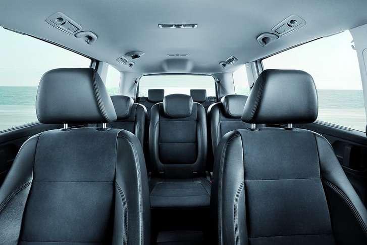 Wewnątrz auta jest komfortowo i funkcjonalnie. Ergonomia jest typowa dla koncernu Volkswagena. Kokpit jest praktyczny i wszystko mamy w zasięgu ręki. Na materiały i jakość wykończenia nie można narzekać. Trochę przytłaczającą czerń podstawowej wersji (Trendline) urozmaicają chromowane wstawki. Do wyboru są trzy wersje konfiguracji – z pięcioma, sześcioma i siedmioma miejscami siedzącymi. W wersji sześcioosobowej w drugim i trzecim rzędzie zamontowane są po dwa siedzenia z tapicerowanymi podłokietnikami (w układzie 2:2:2). Do dyspozycji pasażerów może być maksymalnie 7 indywidualnych miejsc i 33 schowki. Drugi i trzeci rząd siedzeń łatwo się składa i chowa w podłodze dzięki systemowi Easy Fold. Co ważne, po ich złożeniu podłoga jest płaska. Fotele drugiego rzędu można przesuwać, a kąt oparcia jest regulowany. Maksymalna przestrzeń bagażowa ma 2430 litrów (przy załadowaniu po dach). Przy siedmiu miejscach, do wysokości górnej krawędzi oparć, pomieścimy 711 litrów bagażu, a w układzie pięciomiejscowym, bagażnik ma pojemność 885 litrów.