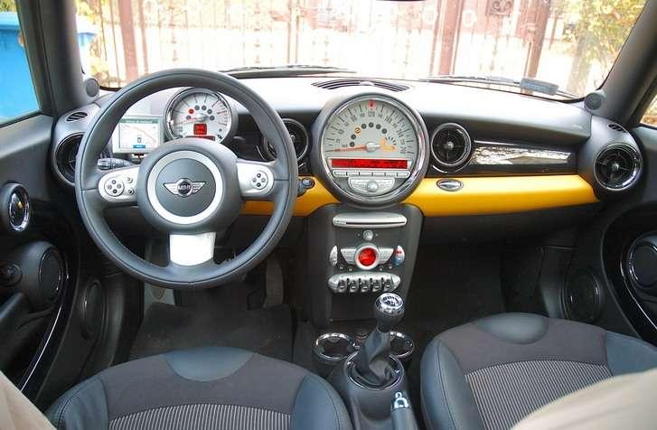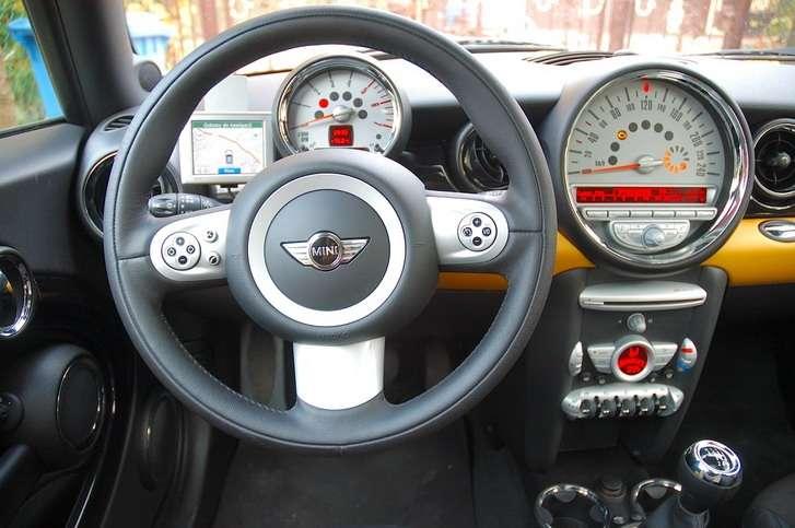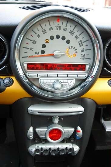 Wnętrze brytyjsko-niemieckiego malucha jest stylowe. Szkoda, że nieco oszczędzano na materiałach wykończeniowych. Do samochodu z półki Premium mogłyby trafić plastiki lepszej jakości. Znakiem rozpoznawczym Mini jest analogowy prędkościomierz na konsoli środkowej. Przed kierowcą umieszczono obrotomierz z niewielkim wyświetlaczem komputera pokładowego, który może prezentować chwilową prędkość.