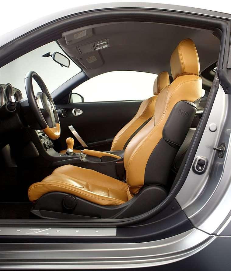 Do niewielkiej kabiny Nissana 350Z trafiły tylko dwa fotele. Kierowca i pasażer nie mogą narzekać na niewystarczające wyprofilowanie siedzeń czy brak miejsca, którego jest dokładnie tyle, ile być powinno. Sporych rozmiarów tunel między kierowcą i pasażerem kryje precyzyjną skrzynię z sześcioma przełożeniami. Jak przystało na rasowe coupe, lewarek zmiany biegów oraz pedał sprzęgła wymagają przykładania dużej siły, co podczas miejskiej jazdy bywa męczące.