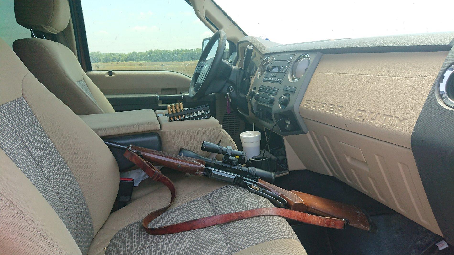 Po otworzeniu drzwi używanego już przez kilka lat Forda F-250 Super Duty widzimy fotel kierowcy, nadszarpnięty już zębem czasu. Fotel sterowany jest elektrycznie na płaszczyźnie przód-tył, do obsługi pozostałych funkcji znajdziemy manualne pokrętła. Materiałowa, jasna tapicerka to kiepski wybór do tak ciężko pracującego samochodu – nie jest łatwo utrzymać ją w czystości.